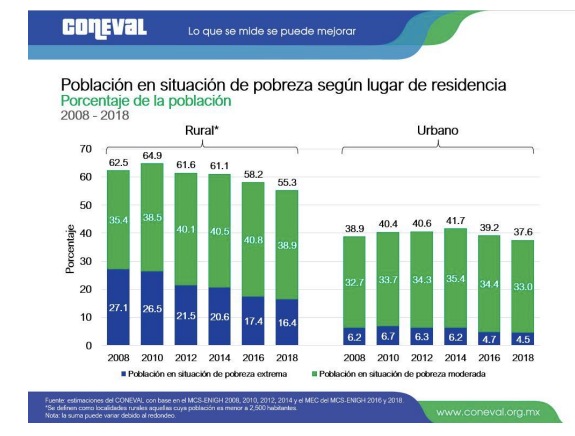 Otro de los puntos a destacar es que, si bien en estos 10 años se ha reducido la brecha de pobreza entre las zonas rurales y urbanas, la pobreza en 2018 en zonas rurales aún sigue siendo mayor, un 55.3% comparado con un 37.6% en las zonas urbanas.