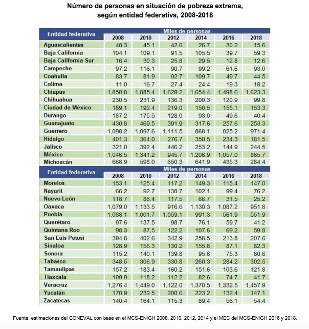 A nivel nacional, aunque el porcentaje de la población en situación de pobreza pasó de 44.4% a 41.9% entre 2008 y 2018, lo que representa una disminución media anual de 0.24 puntos porcentuales, el número de personas en situación de pobreza pasó de 49.5 a 52.4 millones de personas. Por su parte, al analizar el número de personas en situación de pobreza extrema, vemos que si hubo una mejoría real, ya que se pasó de 12.3 a 9.3 millones de personas entre 2008 y 2018, esto es del 11.0% a 7.4%.
